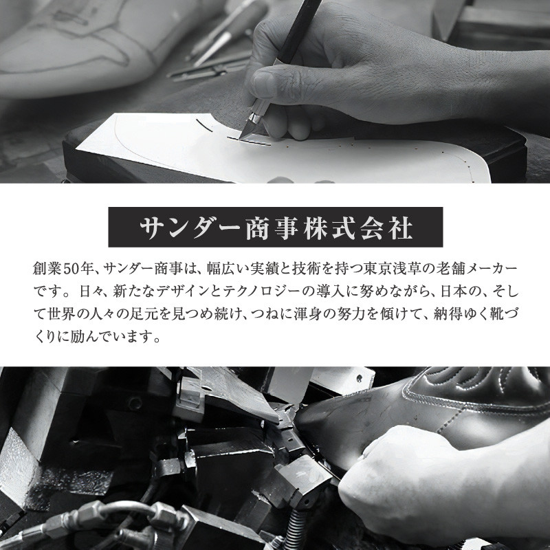 甲革には吟味された天然皮革(牛革)を使用、日本人に足型に合わせて設計した3E木型を採り入れ、中敷きにはショック吸収材を使用し足への負担を軽減した、働く日本人の味方とも言える商品です。