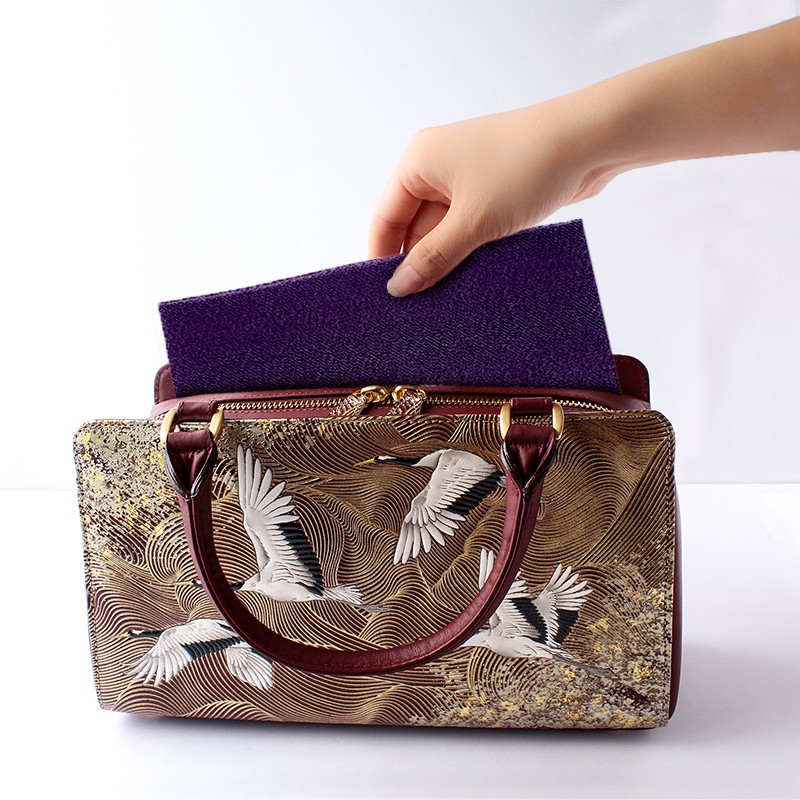 型友禅と手描き友禅の手法を駆使し、職人たちが丹精込めてひとつひとつ手作り 【浅草文庫】利休バッグ〈祝い鶴柄〉 | ハンドバッグ 鞄 レディース フォーマル 本革 牛革 レザー ギフト プレゼント