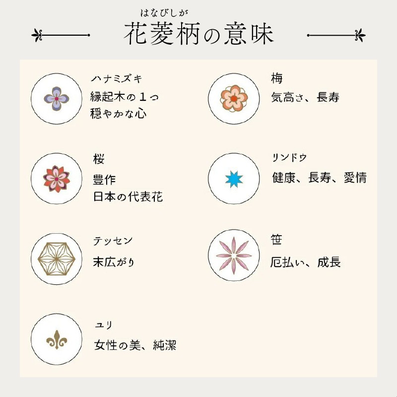 四季折々の縁起がいい草花を7種類あしらった心華やぐ花菱柄。
