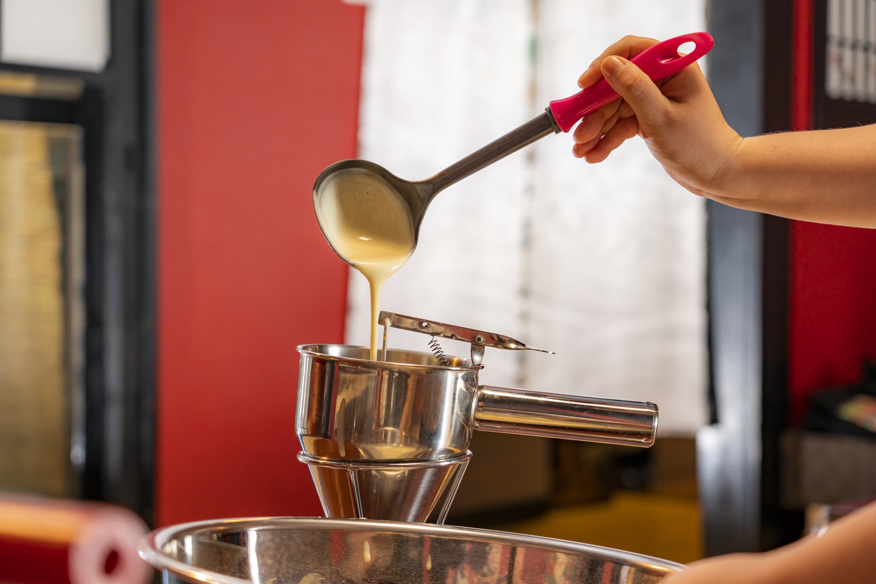 たい焼きの歴史の勉強をしたら、お好きな具材の選択(お1人様2種類)、生地作りから焼き上げまでをご自身で体験していただけます。