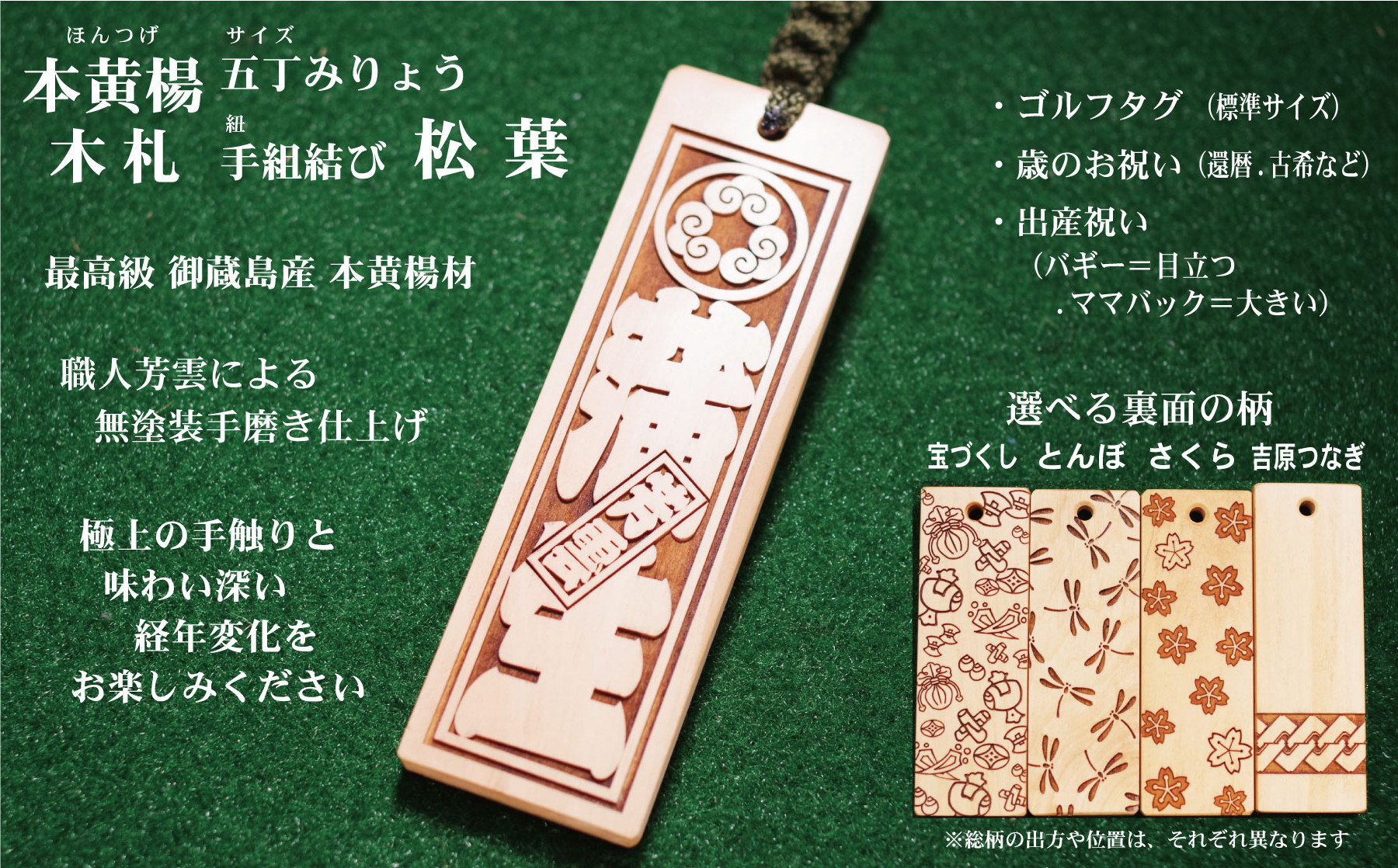 ゴルフバックや鞄に粋な和風タグ!開店・周年祝、出産祝など節目の粋品におすすめ ゴルフ用など◎和風ネームタグ彫刻木札【家紋・短冊入】御蔵島本黄楊(フダヤドットコム.五丁みりょう)(紐:松葉、和柄:とんぼ)