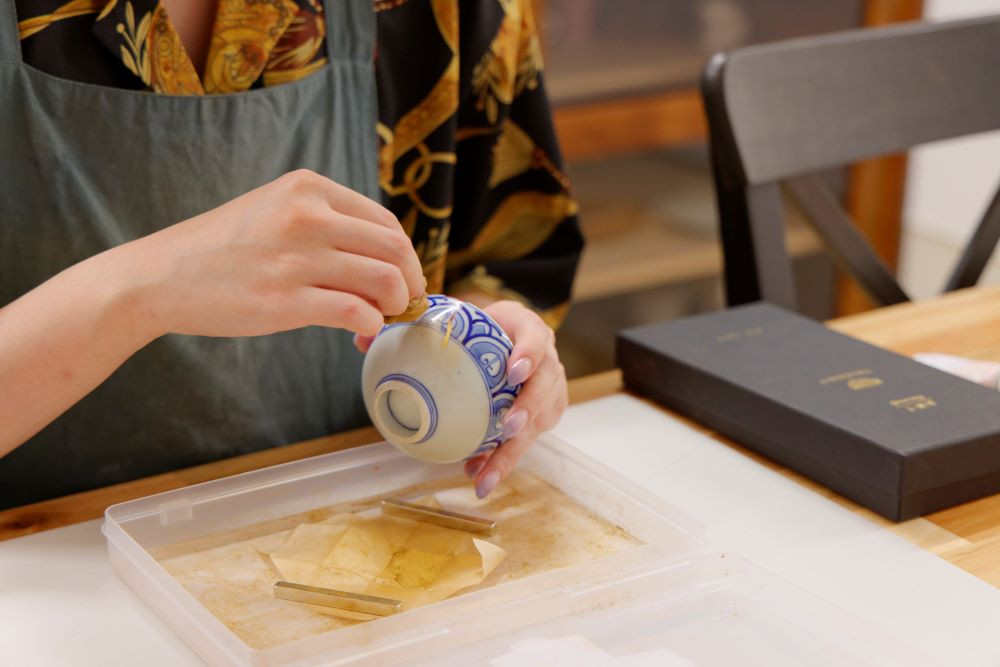 通常数ヶ月という長い時間をかけて完成する金継ぎですが、当ワークショップではその中でも最も重要な最後の工程「金蒔き」を楽しんでいただきます。