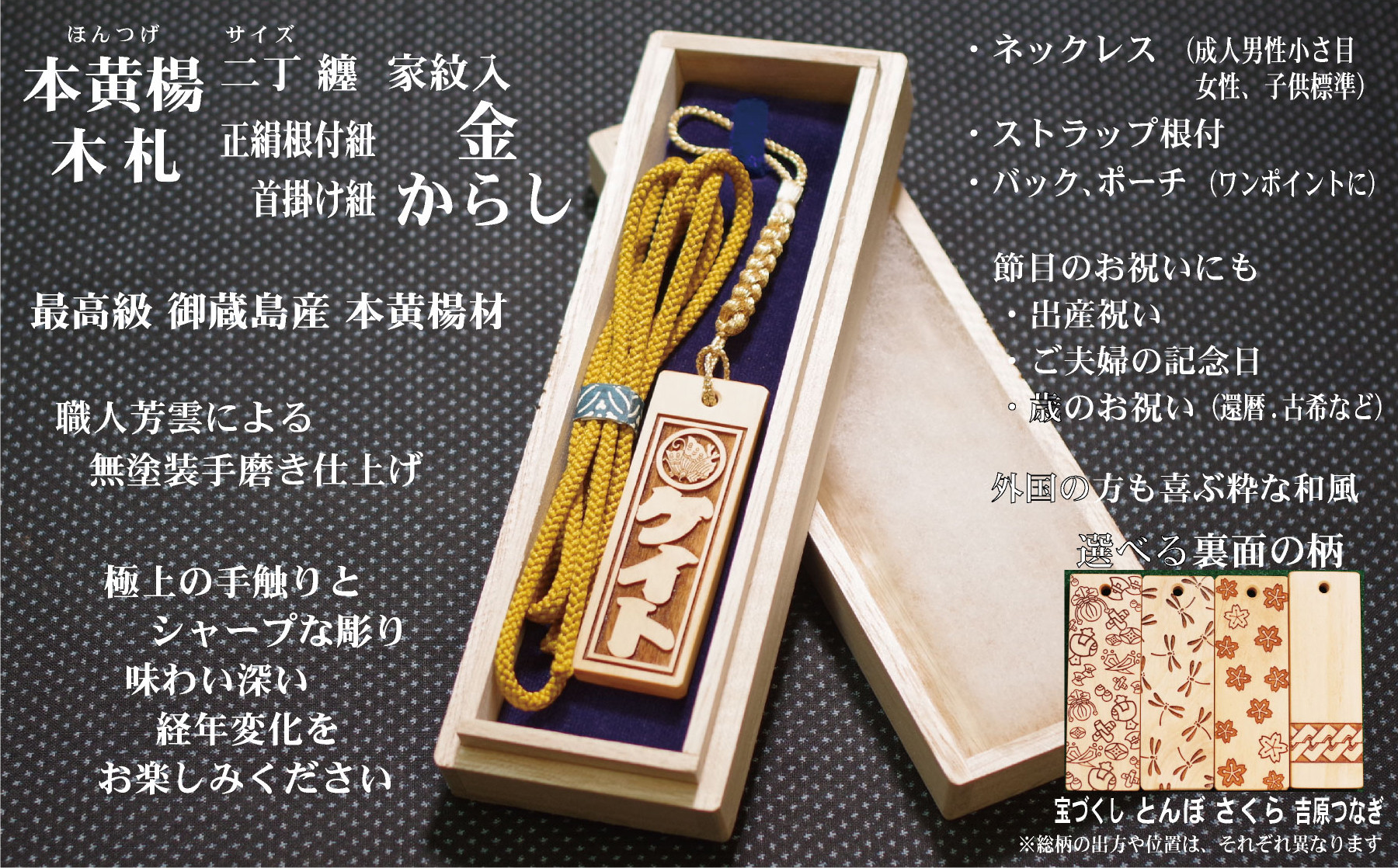 | 容量 | 本黄楊 二丁纏サイズ1個 ・正絹根付紐ストラップ ・ネックレス用首掛け紐 ・桐箱入(スリーブ・手提げ袋) ※ネックレスサイズ:女性、子供向け (男性には小さ目) ※ストラップサイズ:縦60mm×横20mm×厚み5mm ※紐カラー:からし ※和柄:さくら ※彫刻:表面に家紋、縦に文字を彫刻(6文字まで文字数によりバランス調整いたします) |