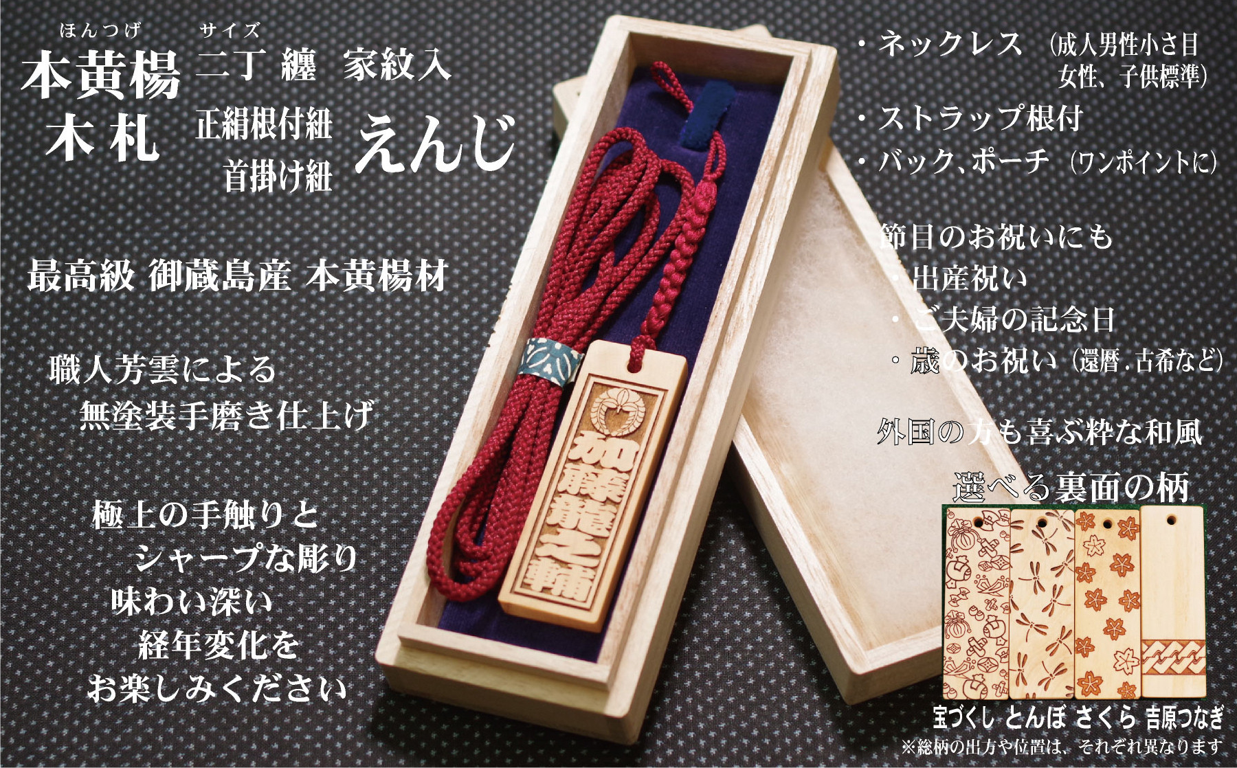 | 容量 | 本黄楊 二丁纏サイズ1個 ・正絹根付紐ストラップ ・ネックレス用首掛け紐 ・桐箱入(スリーブ・手提げ袋) ※ネックレスサイズ:女性、子供向け (男性には小さ目) ※ストラップサイズ:縦60mm×横20mm×厚み5mm ※紐カラー:えんじ ※和柄:宝づくし ※彫刻:表面に家紋、縦に文字を彫刻(6文字まで文字数によりバランス調整いたします) |