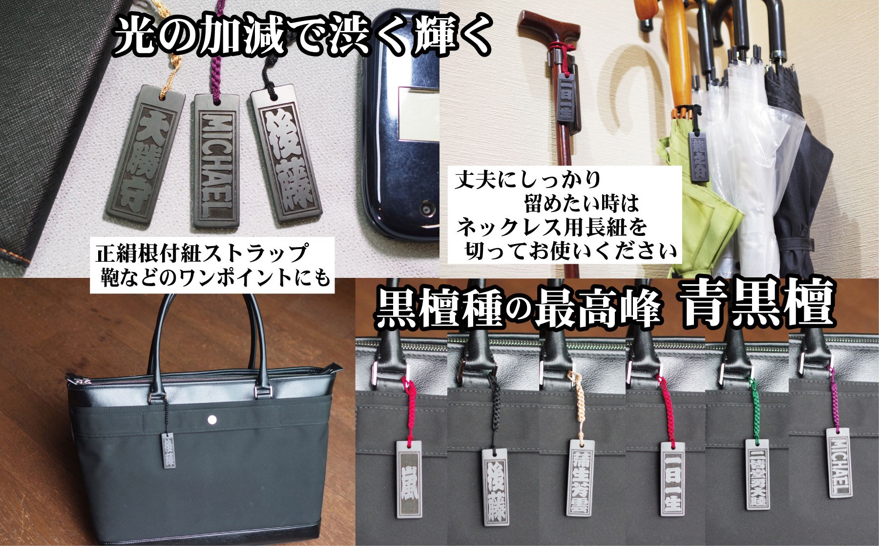 ストラップや小物、胸元にも和風で粋なワンポイントを!開店、出産祝などにもおすすめ 青黒檀ストラップ・ネックレス〈小〉彫刻木札【名入れ等】(フダヤドットコム.二丁纏)(紐:紺、和柄:宝づくし)
