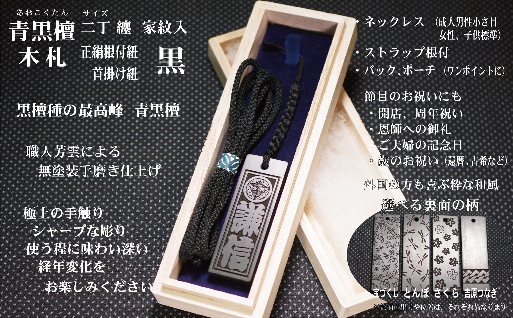 | 容量 | 青黒檀 二丁纏サイズ1個 ・正絹根付紐ストラップ ・ネックレス用首掛け紐 ・桐箱入(スリーブ・手提げ袋) ※ネックレスサイズ:女性、子供向け (男性には小さ目) ※ストラップサイズ:縦60mm×横20mm×厚み5mm ※紐カラー:黒 ※和柄:宝づくし ※彫刻:表面に家紋、縦に文字を彫刻(6文字まで文字数によりバランス調整いたします) |
