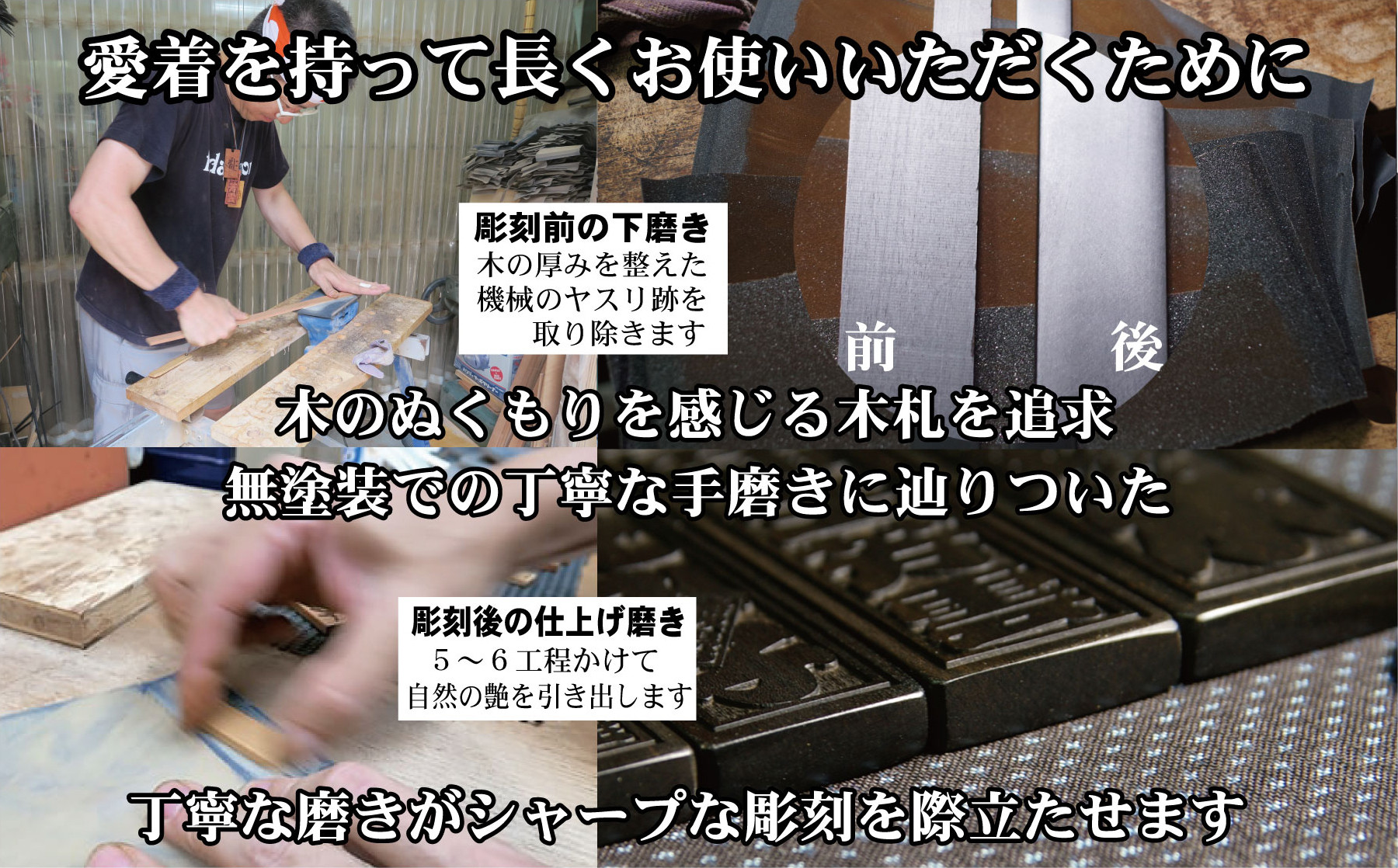手間を惜しまず、時間をかけて丁寧に磨き上げられた木札は、指で触れたときに「あっ」と声が漏れるはずです。