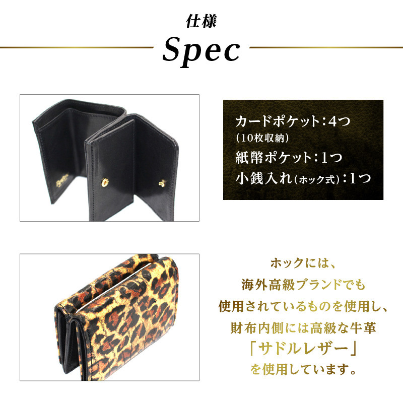 | 容量 | パームウォレット/ハープシール(アザラシ革)箔押し 1点 ■柄:ヒョウ柄 ■SIZE:W/100 H/70 D/30 (mm) ■仕様:カードポケット4つ(7枚収納)、紙幣ポケット、小銭入れ(ホック式) ■素材:ハープシール(アザラシ革)、サドルレザー(牛革)/ 中素材:サドルレザー(牛革)、日本製シャンタン生地 |