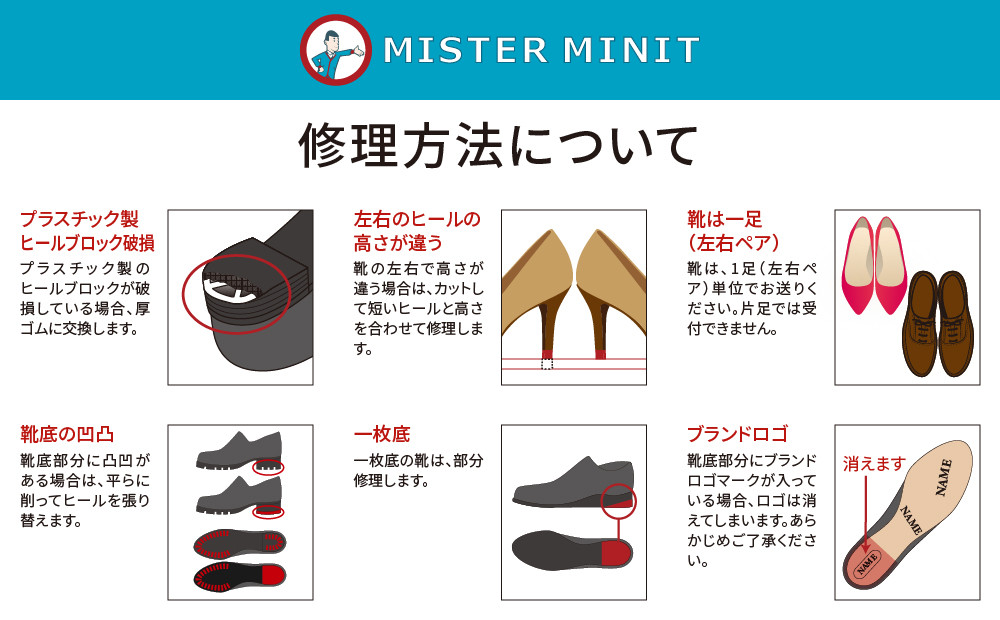 ・ 耐久性・耐水性・通気性に優れた最高級レザーソールであるJRブランドを継承したドイツKILGER(キルガー)社レザー素材やグリップ力が高く摩耗しにくいダイナイトソールなどをお選びいただくこともでき、ミスターミニットの確かな技術を持った職人の手により1点1点丁寧に修理いたします。