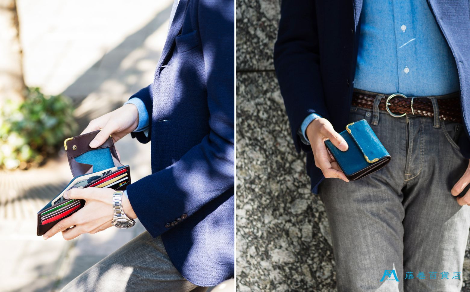 本品の最大の特徴は、その構造にある。通常の二つ折り財布のようにコインケース部分が財布の内側にあるのではなく、あえて「外側」に取り付けることで、コインケースがガバッと大きく開き、中身が見やすく取り出しやすい工夫がされています。さしづめカフェのギャルソンがテーブルチェックの際に使うギャルソンウォレットのように、もたつくことなく会計を済ませられ、もちろん紙幣も入り、カードは8枚納まるなど二つ折り財布のポテンシャルをフルに発揮した収納力を持つ。発色の良いロイヤルブルーはどこか「遊び心」や「余裕のある大人」という印象を醸し出します。