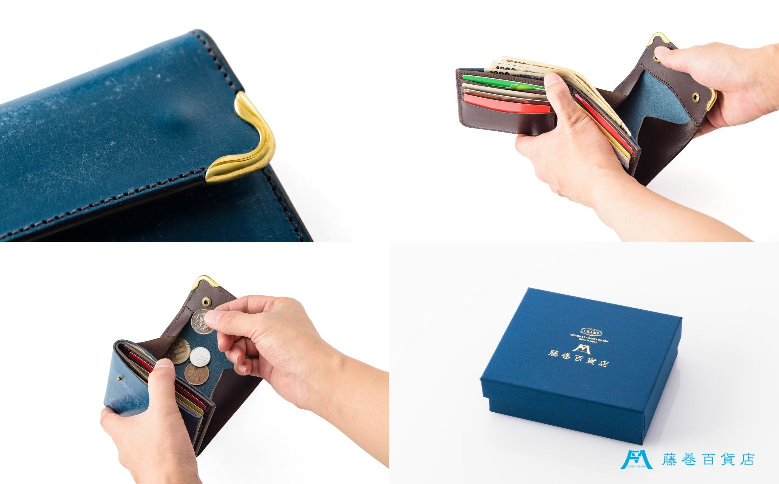 | 容量 | 二つ折りギャルソンウォレット 1点 ※カラー:ロイヤルブルー ※仕様:札入れ×1、カード段×8、小銭入れ×1 ※素材:[外装]UKブライドルレザー(牛革)、真鍮、[内装]イタリア製シュリンクレザー、[ホック]シュトッコ ※本体サイズ:縦10cm×横11cm×厚さ3cm ※箱サイズ:縦11cm×横13cm×厚さ4cm |