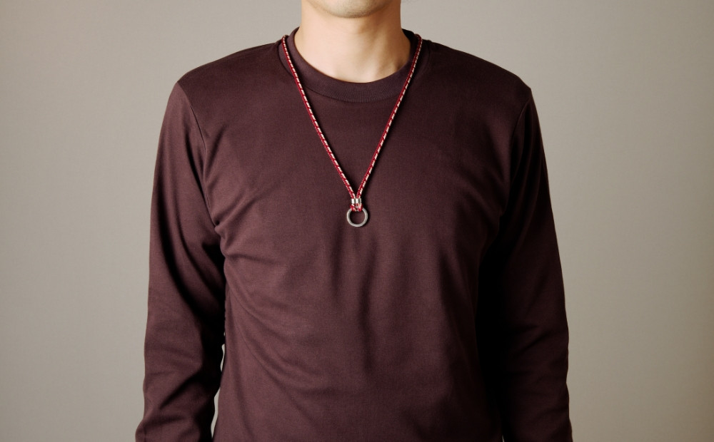 | 容量 | ネックペンダント 1点 ・カラー:暗紅色 ・サイズ:長さ約55cm、重さ約18g ・素材:[リング]925銀製(幅約2.2cm)[金具]亜鉛合金[組紐]正絹(全長約100cm) ※手作りのためサイズは(約)と表記をさせていただいております。 |