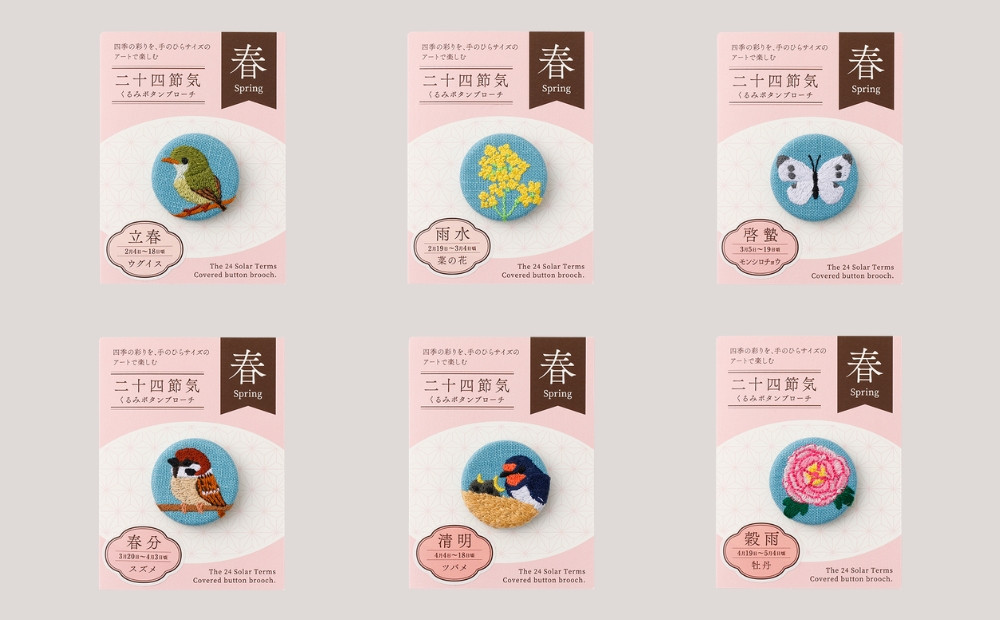 日本の四季折々を小さなブローチに凝縮しました。 二十四節気くるみボタンブローチ | 刺繍 ボタン 動物 熊 鳥 花 月