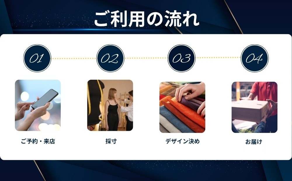 ※完成品のお渡し前に、再度来店いただき、仮縫い(試着、サイズ確認)とサイズ調整を行います。