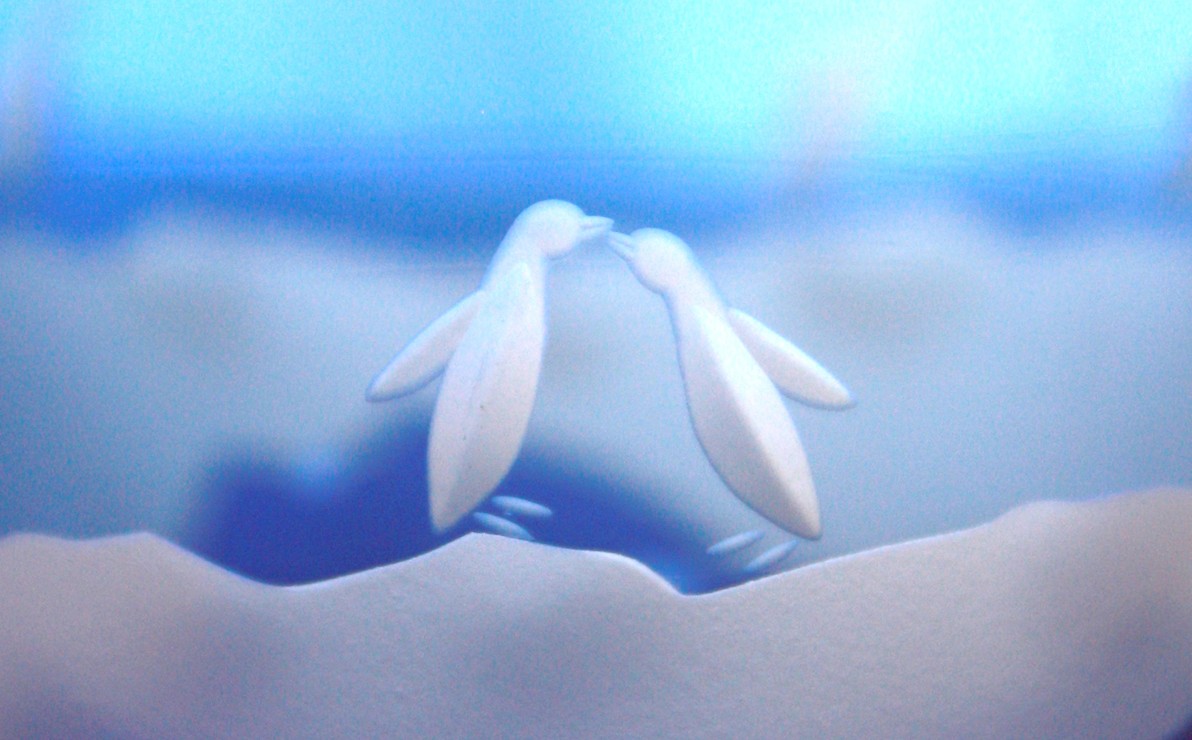 ペンギンのカップルが戯れる様子を三面に描いたグラスです。