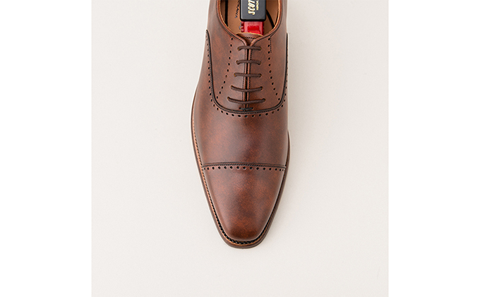 国産高級カーフの質感と丈夫で修理も可能なグッドイヤー製法で作り上げた、セミスクエアのシャープなモデルです。ブローグ(小穴)はステッチが無い為、スッキリと見えます。