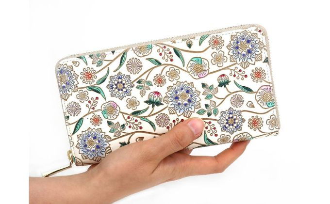 ベーシックな長財布で、当店支持率No.1のお財布です。大きく開いて、仕切りもたくさん。急いでいる時も、ひとまず物を詰めてファスナーさえしめてしまえば便利です。 縦幅が大きめで、通帳も入るサイズなので、お出かけ先で記帳を済ませたい時にはお財布にひとまとめ。 【職人のこだわり】 ★中は四つに仕切られていて、お札やレシートを分けてしまえます。カードポケットは12ヶ所、両脇にはロングポケットがあります。 ★真ん中の仕切りは、ファスナーが付いていて、マチ付きの小銭入れになっています。 ★高さも幅も大きめにとってありますので、通帳なども入る大きさです。何よりもこの大きさは柄映えがするので、文庫革が引き立ちます。 ★色とりどりの花と鳥が沖縄の伝統染物である紅型(びんがた)を彷彿とさせる「花鳥(かちょう)」柄。 創業者の大関卯三郎は、遠い沖縄の地に思いを馳せ、製作をしたのでしょうか。 涼やかな流水モチーフと琉球紅型を融合させた斬新な絵柄をお楽しみください。 ※画像はイメージです。 ※文庫革製品は、一つ一つ手塗り、手作業による製作ですので、個体差がございます。 ※本サイトの写真とは若干の差異生じる場合がございます。あらかじめご了承いただきますようお願いいたします。また、本サイトでご覧いただく色味は、お使いいただいているパソコン環境により若干の差異が生じます。こちらも、ご了承いただきますようお願いいたします。 ※手作りのため、お届けまでに3ヶ月~4ヶ月程度かかります。