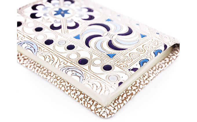白革に型を押し (浮世絵柄、小紋柄、花柄、等)、一筆一筆彩色を施し、漆で古びをつける行程(『錆入れ』(さびいれ)と呼ばれます)を経て、 お財布や小物などに縫製して仕立てます。