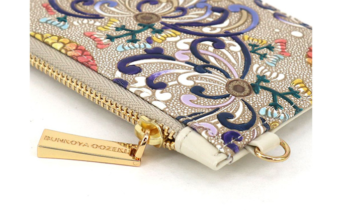 キャッシュレス時代にぴったり!最小限のカード類をすっきりと収納できる、薄くてスマートな小銭入れの進化系、フラグメントケースです。便利な着脱可能リングチェーン付き。 【職人のこだわり】 くるりと丸みのあるラインが特徴のペイズリー柄。 東欧の小さな村に降りそそぐ、光のような優しい色をいっぱいに広げました。植物の生命力をイメージし、ツルや花びらを躍動的にのびのびと表現。蝶々も飛んできて、みんな賑やかにクルクルと踊り出します。小さな村の春風を感じ、ポルカの楽し気な演奏が聞こえてきそうです。 ※画像はイメージです。 ※文庫革製品は、一つ一つ手塗り、手作業による製作ですので、個体差がございます。 ※本サイトの写真とは若干の差異生じる場合がございます。あらかじめご了承いただきますようお願いいたします。また、本サイトでご覧いただく色味は、お使いいただいているパソコン環境により若干の差異が生じます。こちらも、ご了承いただきますようお願いいたします。 ※手作りのため、お届けまでに3ヶ月~4ヶ月程度かかります。