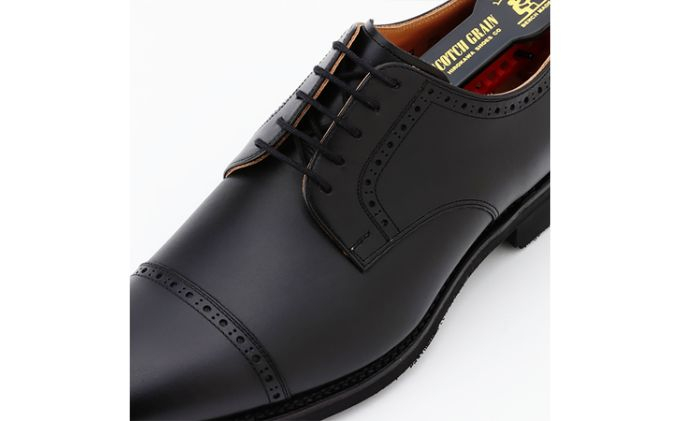 創業以来50年もの長きに渡って、主に紳士靴の生産をしているスコッチグレイン。 シンプルだからこそ、美しいフォルムが際立つ。紳士靴本来の美しさを追求したデザインが、このストレートチップ。シングルEのシャープなライン、低く抑えたトゥ、ノーズは細く長く、ヒールカップもシャープにと、無駄の無いすっきりしたデザインに仕上げました。コバの仕様も矢筈コバにすることで、より華奢なイメージが出るようにと細部にもこだわりました。正統派の内羽根式ストレートチップ。エレガントで端正な顔立ちの一足です。 高級カーフに上質で繊細なテクスチュアを施した甲革は、お手入れするほど光沢感に磨きがかかり、本格革独特の味わいをお楽しみいただけます。さらに「モルトドレッシング」で磨き上げた光沢は、一級の革靴を楽しむ喜びを味わうとともに、いつまでも飽きのこない光沢と質感をもたらしてくれます。 この製品に使用されています本底はトップゴムレザーソールとなります。良質なヨーロッパ原皮を使い、イタリアにて鞣された革底です。日本の自社工場にて、底部分より減りやすいと言われるつま先部分に対して、ゴムを付けることで減りが軽減できるように加工しております。雨などの影響で革が乾燥し硬くなることで、持ちが悪くなるのでご注意ください。 【 ご注意点 】 ・革底のため雨天等にご利用頂くと寿命が短くなることがございます。 ・汗を吸い易い為、毎日同じ靴をお履きにならず交互にお履きください。 ・中底は環境や体に配慮された天然皮革を使用している為「色落ち」する恐れがあります。 ・素材に合ったクリーム等でお手入れしてください。 ・防水スプレーやクリーナー等のご使用で、効果が得られず、シミや色落ちの原因になることがございます。 ◎詳しくは、ホームページや箱裏面にご注意書きがございます。