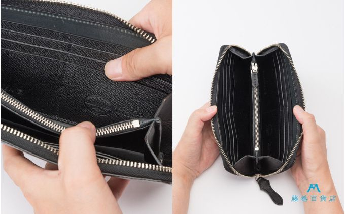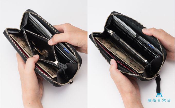 | 容量 | 素材:ホーウィン社シェルコードバン、クロムエクセルレザー サイズ:縦約9.8cm×幅約20cm×厚さ約2.3cm 仕様:札入れ×2、カードポケット×12、ファスナー付き小銭入れ×1、フリーポケット×2 重量:約290g 生産国:日本 |