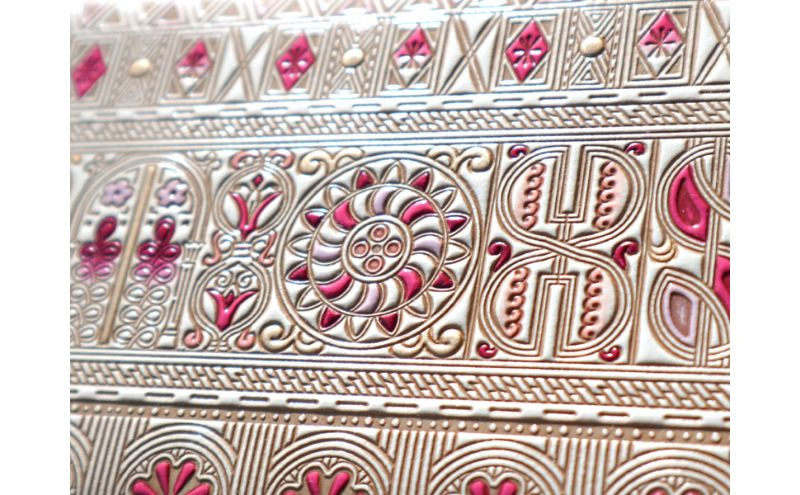 白革に型を押し (浮世絵柄、小紋柄、花柄、等)、一筆一筆彩色を施し、漆で古びをつける行程(『錆入れ』(さびいれ)と呼ばれます)を経て、 お財布や小物などに縫製して仕立てます。