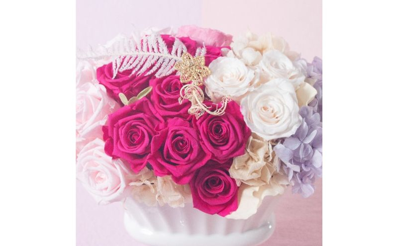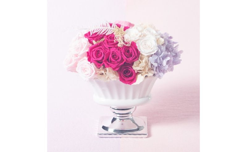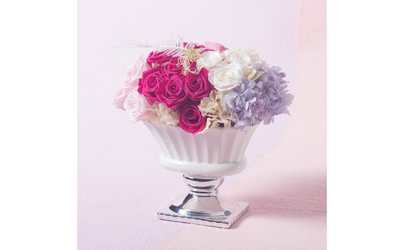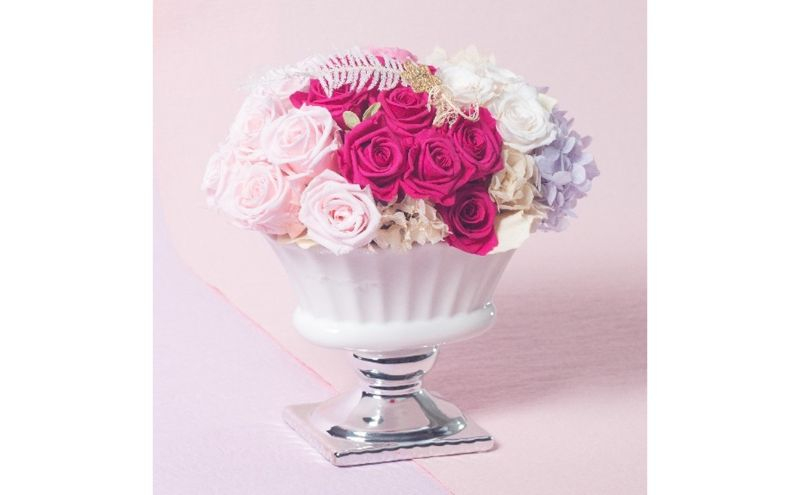 ふうわりと可愛すぎない大人の色気漂う、エレガントなプリザーブドフラワーアレンジメントです。花器も上質な陶器をご用意いたしました。おおよそのサイズ感と致しましては横幅24cm、奥行き17cm、高さ24cmくらいです。ご自宅のインテリアとしてはもちろん、プレゼントとしても大変人気です。プリザーブドフラワーとは生花の組織を保ちながら特別な処理を施すことで瑞々しく柔らかな風合いを保つことが出来る花材です。生花の様に発色が良く、かつドライフラワーの様に枯れることなく長期間楽しめる素晴らしいお花です。また、水やりも不要かつ土も使わないので菌も繁殖しません。アレルギーの原因となる花粉もありません。ゆえに飾る場所も選びません。玄関、ベッドサイド、食卓等々アイデア次第で楽しみ方の幅は広がります。