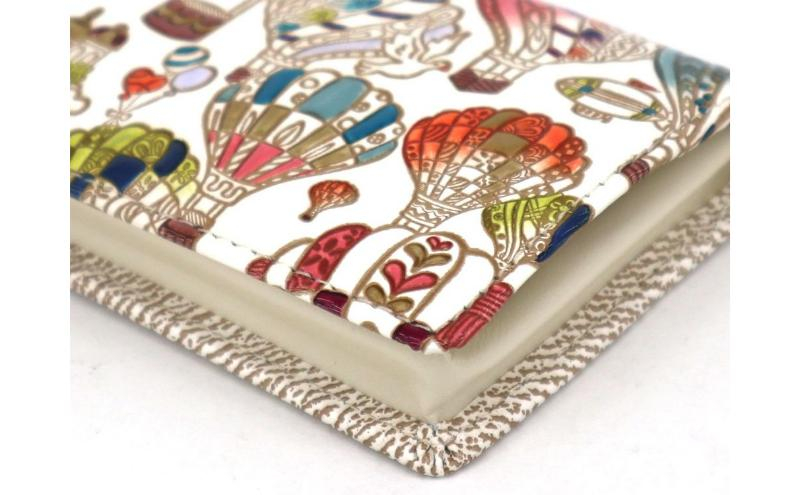 様々な色合いの気球が無数に描かれた柄です。ぽっかり浮かんだ気球と気球の間には、幸福の象徴である鳩や風船、お城などの可愛らしいモチーフが描かれています。少しダークトーンで彩色し、落ち着いた色合いの「大人かわいい」仕上がりになっています。