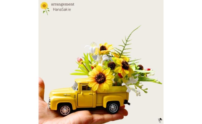 ひまわりミニカー 造花 アレンジ インテリア 可愛い ミニチュア アレンジメント ギフト プレゼント 雑貨 ひまわり イエロー 墨田区 東京[№5619-2374]