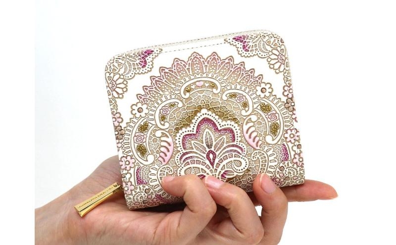 【文庫屋大関】二つ折りファスナーミニ財布 アンティークレース<ピオニー>【皮革工芸品】財布 二つ折り 小物 お札 カード 小銭 コンパクト 牛革 手作り 日本製 墨田区 東京都 [№5619-2027]