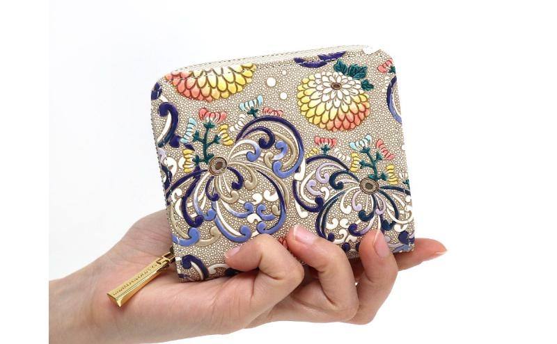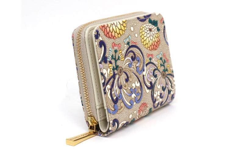 【文庫屋大関】二つ折りファスナーミニ財布 乱菊<青紫>【皮革工芸品】財布 二つ折り 小物 お札 カード 小銭 コンパクト 牛革 手作り 日本製 墨田区 東京都 [№5619-2036]
