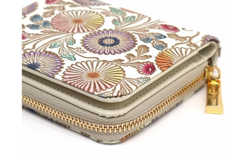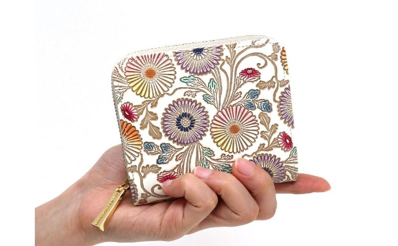 【文庫屋大関】二つ折りファスナーミニ財布 更紗菊【皮革工芸品】財布 二つ折り 小物 お札 カード 小銭 コンパクト 牛革 手作り 日本製 墨田区 東京都 [№5619-2046]
