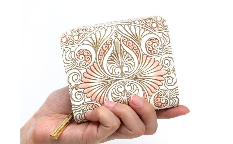 【文庫屋大関】二つ折りファスナーミニ財布 ロカイユ<ベビーピンク>【皮革工芸品】財布 二つ折り 小物 お札 カード 小銭 コンパクト 牛革 手作り 日本製 墨田区 東京都 [№5619-2049]