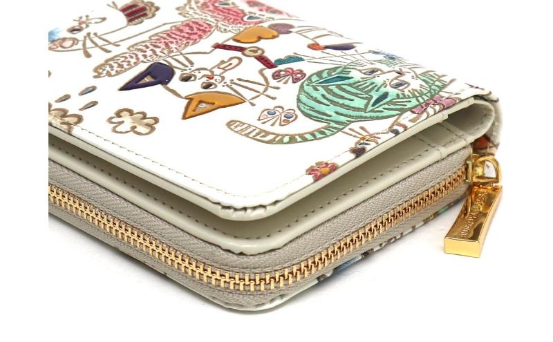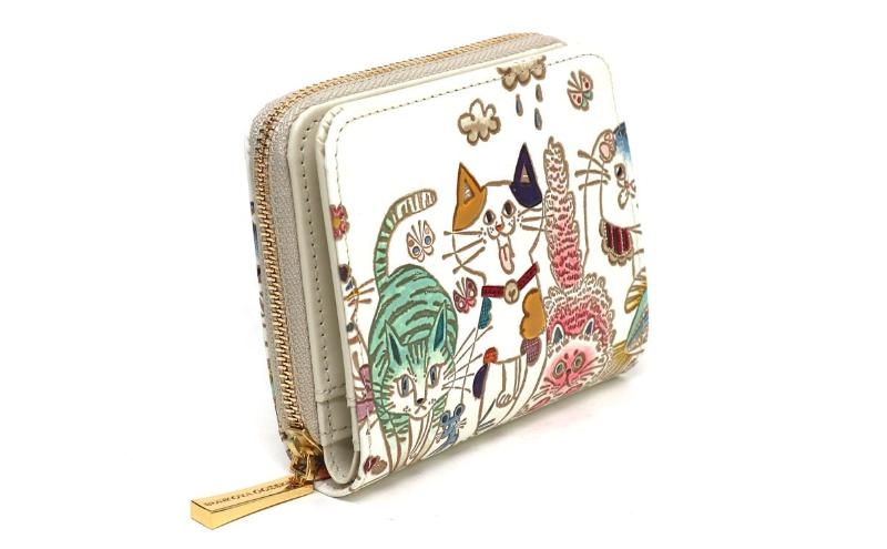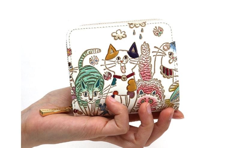 【文庫屋大関】二つ折りファスナーミニ財布 ネコ集合【皮革工芸品】財布 二つ折り 小物 お札 カード 小銭 コンパクト 牛革 手作り 日本製 墨田区 東京都 [№5619-2050]