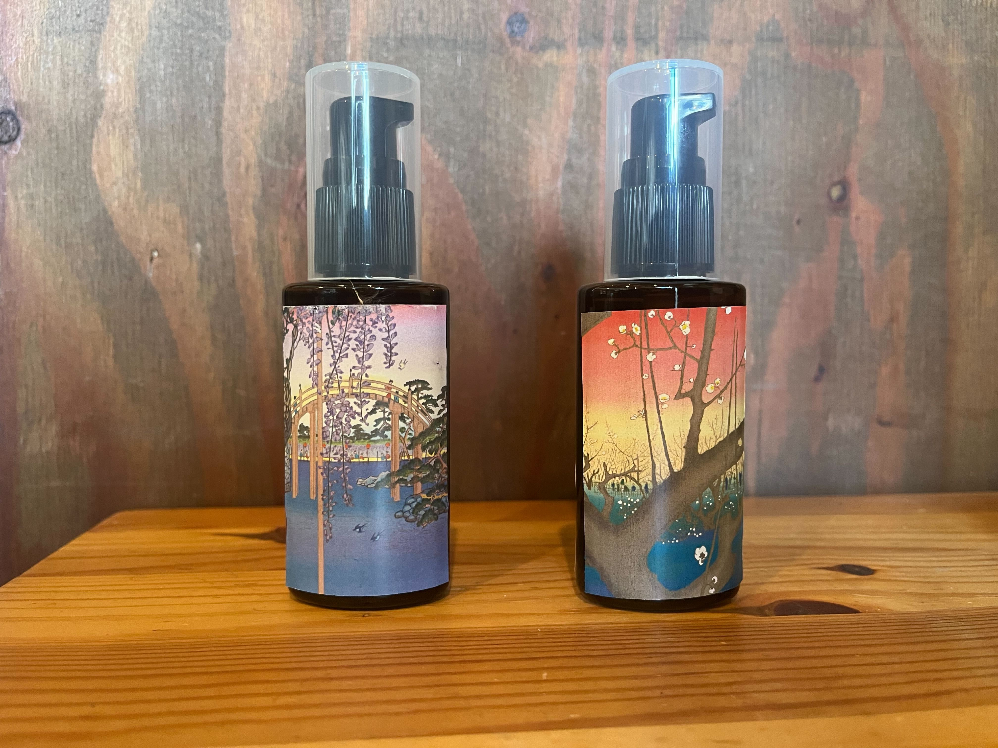 「江東区ノスタルジックな名所を思い出としてお土産に」というコンセプトで江東区の名所である「亀戸天神の藤」、「亀戸梅屋敷」をモチーフにしたヘアオイルです。