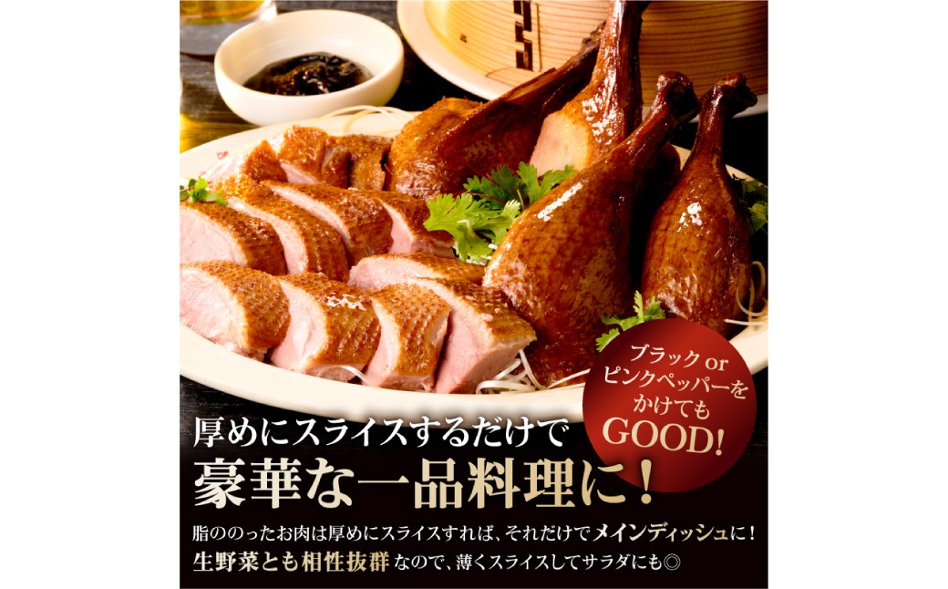 アヒル1羽丸ごとスモークした品で、アヒル丸ごとを特製タレで漬け込んだ後、じっくりとスモーク(燻製)し、風味を加えた品です。燻製することで、肉の旨味が引き立ち、煙の香りが肉に染み込むため、独特の風味が楽しめます。