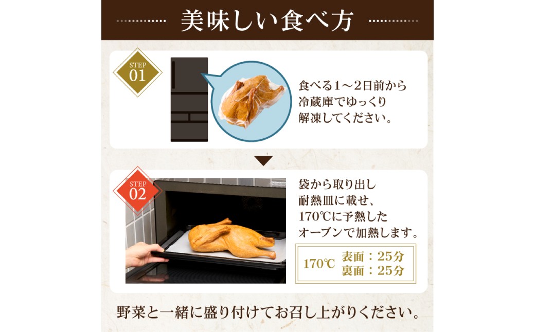 お召し上がり方は、スモークダックを袋のまま冷蔵庫内で1~2日かけて解凍し、袋を開け耐熱皿にのせオーブンで加熱します。(170℃の予熱後、170℃で表面25分、裏面25分加熱します。)加熱が終わったら、ブロッコリーなど付け合わせればパーティーのメインディッシュになります。スモークの香りとアヒル肉の濃厚な味わいが特徴的で、高級感のある食材です。