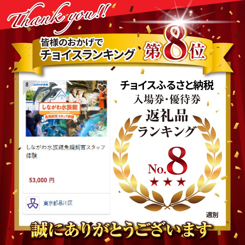 | 容量 | 〇お礼品の内容について 魚類飼育スタッフのお仕事(調餌、餌やり、BY説明等)を体験できるプログラム(体験時間:約1時間) 入館料含む(1名+付き添い1名まで利用可) |