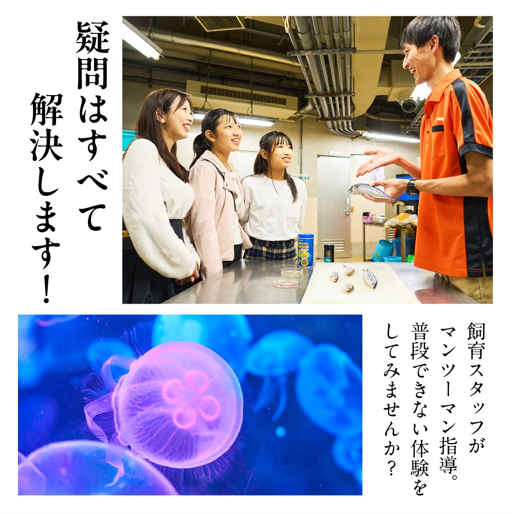 水族館入館券(本人+付き添い1名まで入館可能)も付いているので、体験の前後に館内見学することも可能です。