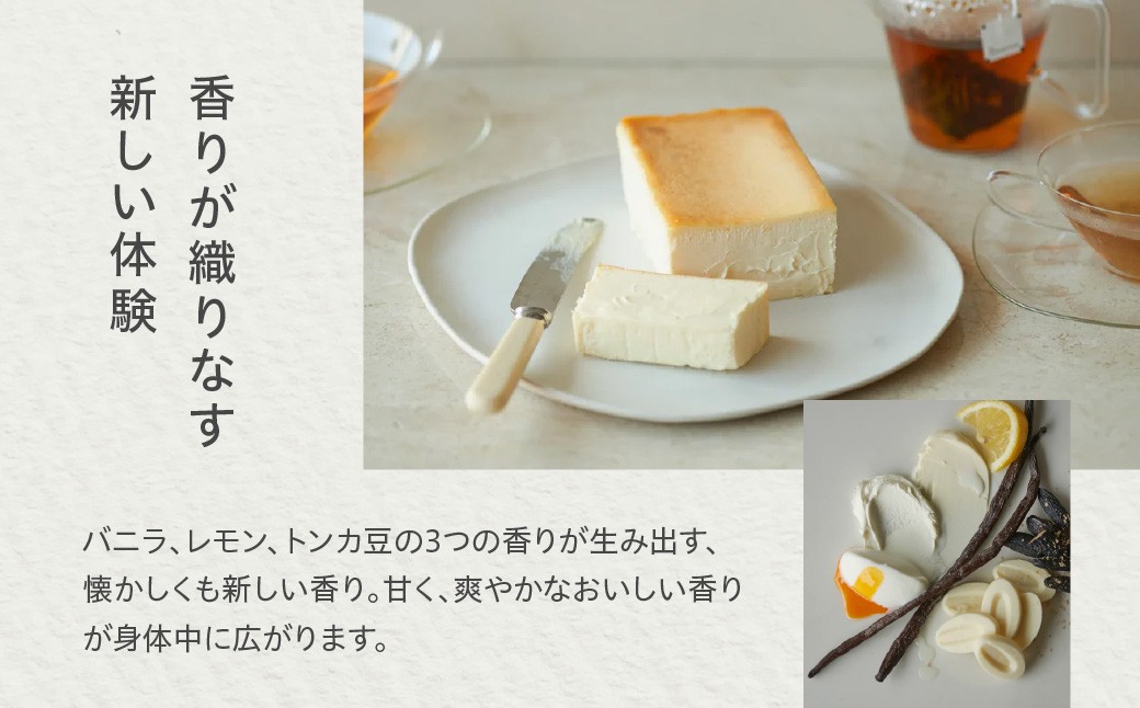 バニラ、レモン、トンカ豆の3つの香りが生み出す、懐かしくも新しい香り。甘く、爽やかなおいしい香りが身体中に広がります。