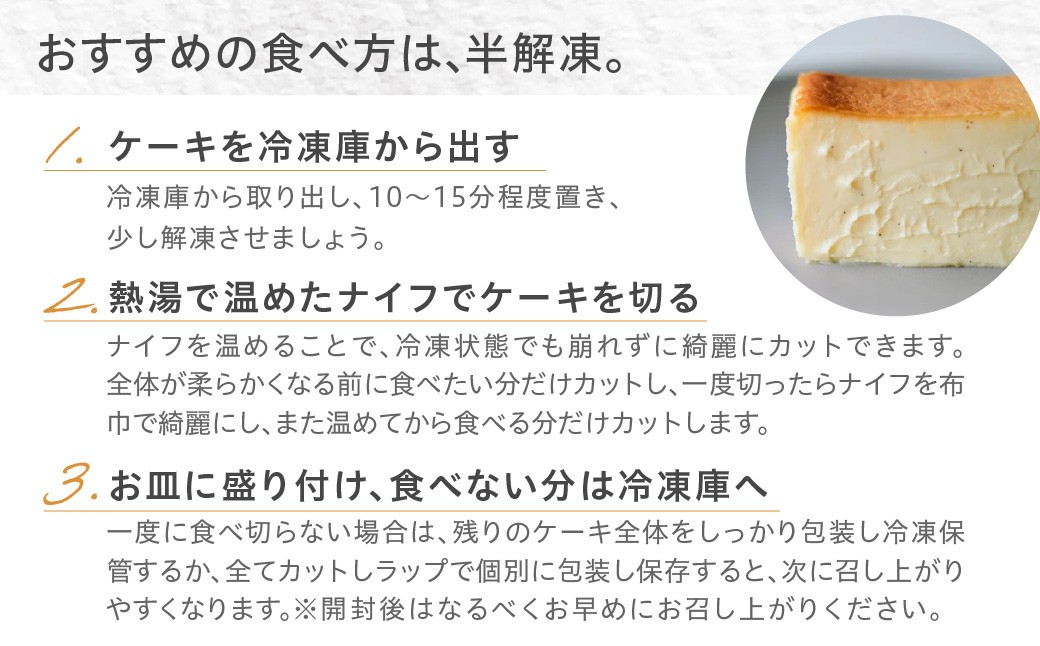 一回で全て食べきらない場合には、食べない分のケーキ全体をしっかり包装して冷凍保管いただくか、全てカットし、ラップで個別に包装して保管しておくと、次に召し上がりやすくなります。