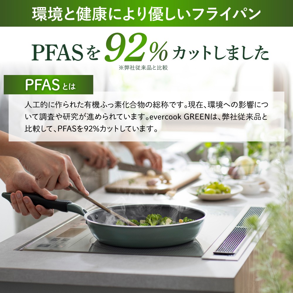 従来品からフッ素を92%カットしたevercookの新シリーズ! 【選べるラインナップ】evercookGREEN IH フライパン (20cm/24cm/26cm/28cm/28cm深型/玉子焼き)