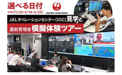 容量 | 【選べる日付】JALオペレーションセンター(IOC)見学と運航管理者模擬体験ツアー 1.JALオペレーションセンター(IOC)の施設案内(1時間程度) 2.運航管理者による運航管理基礎講義(2時間程度) 3.機内食の試食(1時間程度) ※当日の運航状況によっては、JAL オペレーションセンター(IOC)の施設内部の見学を短時間でのご見学とさせて頂く可能性があります。 【注意事項】 ・画像はイメージです。 ・対象者は高校生以上とさせていただきます。 ・服装は自由です。温度調節のできる服装でお越しください。 ・開始時間から15分を過ぎますと、本講座を受講いただけない場合がございます。 ・体験中は、係員の指示に従ってください。訓練施設内での写真・動画撮影は保安上の理由などにより制限させていただく場合があります。 ・当日は取材関係者(新聞・雑誌・TV・WEBメディアなど)やJALグループのスタッフがツアーの様子を撮影し、お客さまの容姿を確認できる映像・写真などを使用させていただく場合があります。 ・当日の運航状況により、プログラムの内容が変更になる可能性があります。 ・プログラム参加中は、係員の指示に従ってください。施設内の設備、装置、機器、什器などには、許可なく触れないでください。係員の指示に従っていただけない場合には、プログラムを中止させていただくこともございます。 ・当プログラムに参加するにあたって会場への往復路、およびプログラム中や会場敷地内で起こった事故やケガにつきましては全てお客さまご自身の責任となります。 ・当プログラムに参加することに関連する全てのリスク(自然災害、悪天候による影響、交通のトラブル)などを理解した上でご参加ください。 ・当プログラム参加に当たり個人の持ち物(貴重品を含む)はお客さま自身での自己管理となっております。荷物の取り違い、盗難、破損などのリスクがあることを理解した上でご参加ください。これらが発生した場合も含め、プログラム主催側、プログラム事務局および全てのプログラム関係者に対し、当プログラム参加により生じたお客さまの損害に対する一切の責任を免除し、損害賠償ならびにそれに準じた請求を放棄することについて、あらかじめご了承ください。 |