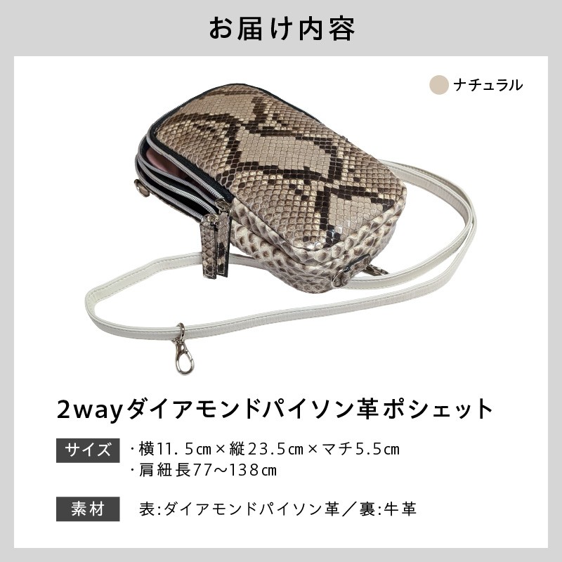 軽く、使う程に艶が出て味のある風合いに変化していきます。 2wayダイアモンドパイソン革ポシェット(B-304C・ナチュラル)