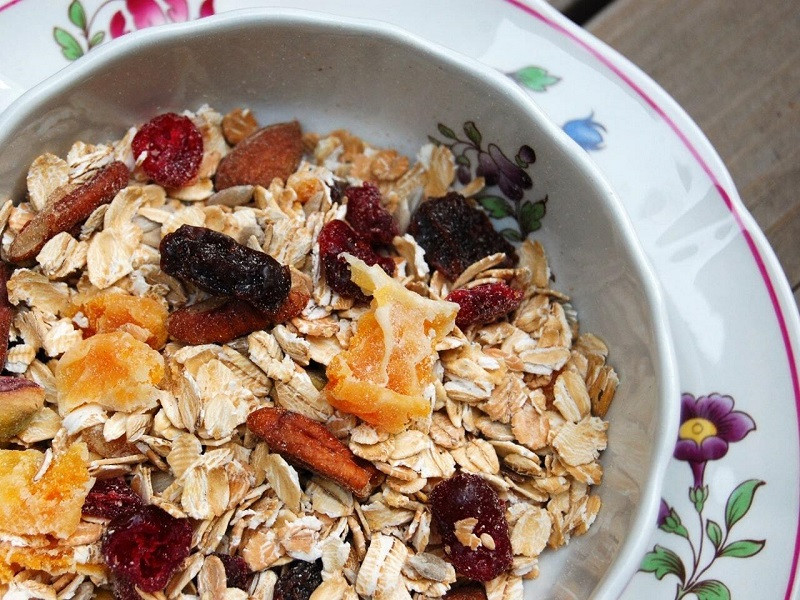 栄養豊富で腹持ちのよい全粒穀物のオーツ麦フレーク(オートミール)、そこにフルーツ&ナッツを入れて焼き上げたミューズリー、さらにメープルシロップで甘みを入れたグラノーラ。