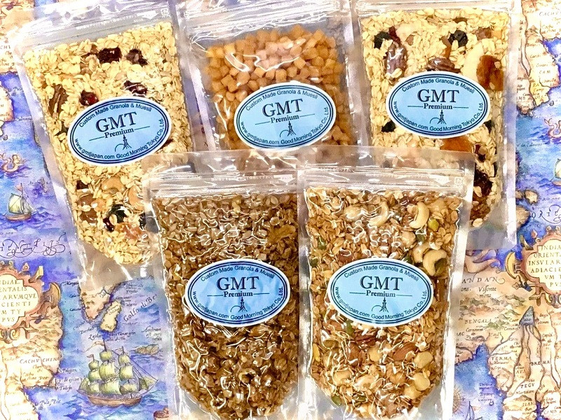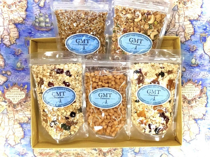 2010 年東京目黒にオープンしたシリアル専門店【GMT】がおすすめする、バラエティ豊かなシリアル4種にドライフルーツを加えた5種の詰め合わせです。