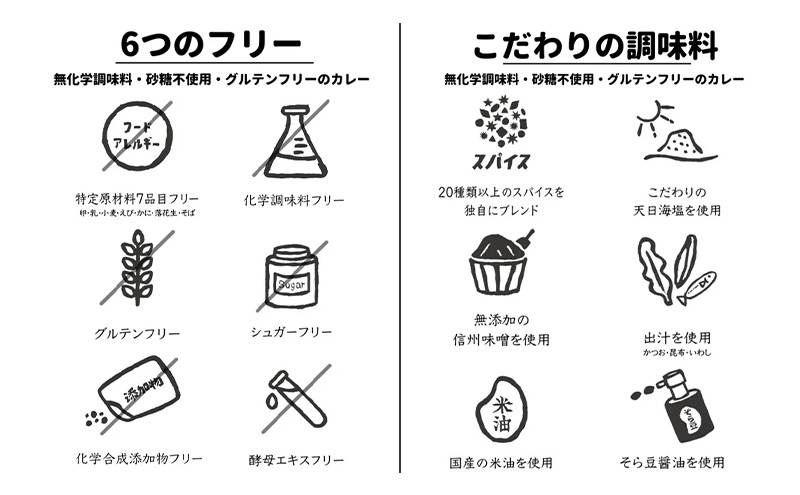 化学調味料無添加・砂糖不使用・グルテンフリー・合成着色料無添加・人工甘味料無添加・合成香料無添加・酵母エキス無添加、特定原材料7品目(乳・卵・小麦・えび・そば・かに・落花生)不使用です。