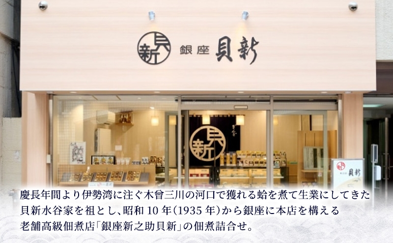 慶長年間より伊勢湾に注ぐ木曾三川の河口で獲れる蛤を煮て生業にしてきた貝新水谷家を祖とし、昭和10年(1939年)から銀座に本店を構える老舗高級佃煮店「銀座新之助貝新」の佃煮詰合せ。