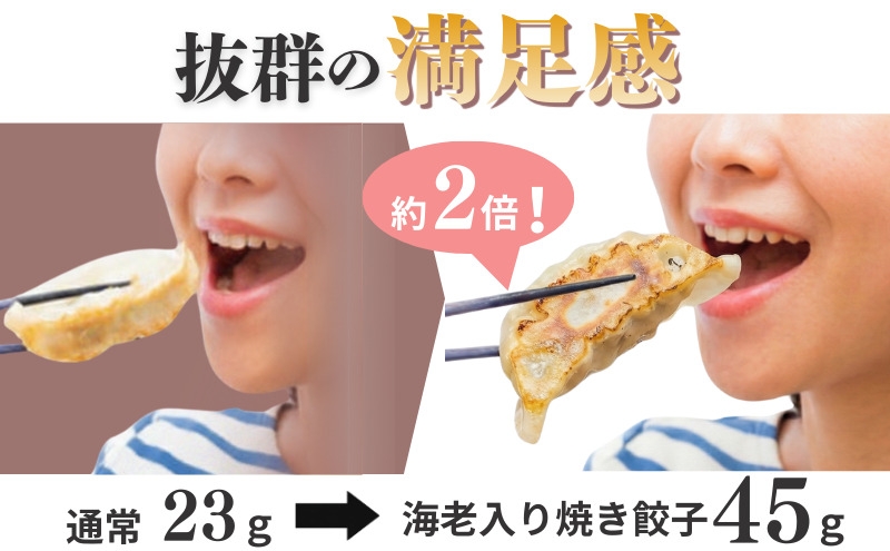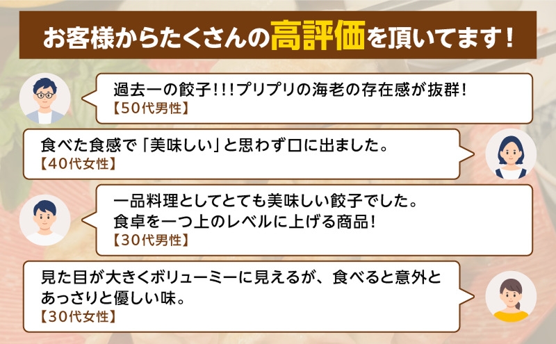 地元に愛され続けてきた名物・海老入り焼き餃子は、職人が一つひとつ丁寧に手包みしています。ぷりぷりの海老を丸ごと1尾使用し、また豚ひき肉ではなく贅沢に豚バラ肉を使用。