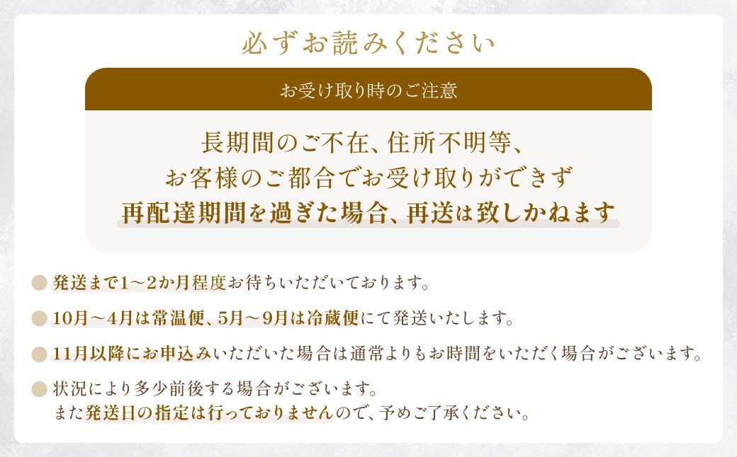 発送まで1~2か月程度お待ちいただいております。 ※10月~4月は常温便、5月~9月は冷蔵便にて発送いたします。 ※11月以降にお申込みいただいた場合は通常よりもお時間をいただく場合がございます。 ※状況により多少前後する場合がございます。また発送日の指定は行っておりませんので、予めご了承ください。 ※長期間のご不在、住所不明等、お客様のご都合でお受け取りができず再配達期間を過ぎた場合、再送は致しかねます。 |